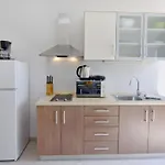 Una pequeña cocina está equipada con nevera y menaje de cocina a disposición de los huéspedes.